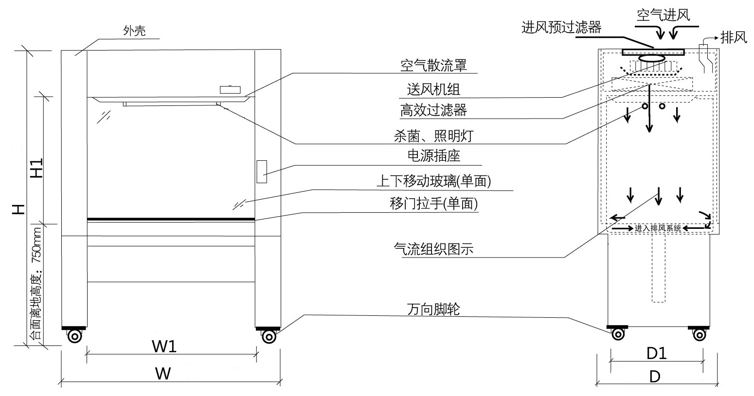 凈化工作臺由箱體、風(fēng)機(jī)、高效過濾器、操作開關(guān)等幾大部件組成。箱體采用彩鋼板等制作,表面噴塑處理,工作臺面采用不銹鋼制作。凈化單元采用了可調(diào)風(fēng)量的風(fēng)機(jī)系統(tǒng),通過調(diào)節(jié)風(fēng)機(jī)的工作狀態(tài),可使?jié)崈艄ぷ鲄^(qū)中的平均風(fēng)速保持額定范圍內(nèi),而且有效地延長了高效過濾器使用壽命。